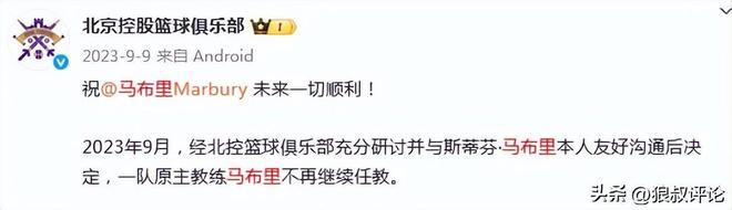 经北控篮球俱乐部充分研讨并与斯蒂芬·马布里本人友好沟通后决定,一队原主教练马布里不再继续任教。