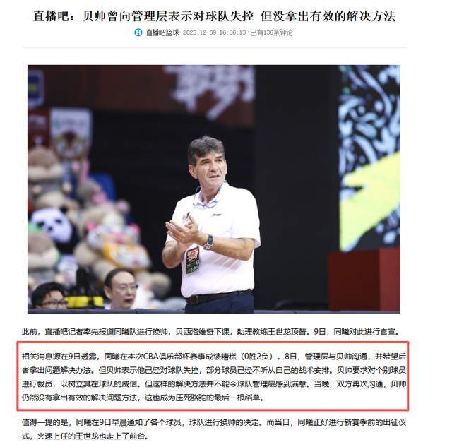 事情的真相真是如此吗?直播吧对此给出了最新的说法,没想到,并非家庭原因,也非战绩原因,而是“对球队失控”。按照直播吧在12月9日16点06分的报道,“相关消息源在9日透露,同曦在本次CBA俱乐部杯赛事成绩糟糕(0胜2负)。8日,管理层与贝帅沟通,并希望后者拿出问题解决办法。但贝帅表示他已经对球队失控,部分球员已经不听从自己的战术安排。贝帅要求对个别球员进行裁员,以树立其在球队的威信。但这样的解决方法并不能令球队管理层感到满意。当晚,双方再次沟通,贝帅仍然没有拿出有效的解决问题方法,这也成为压死骆驼的最后一根稻草。”