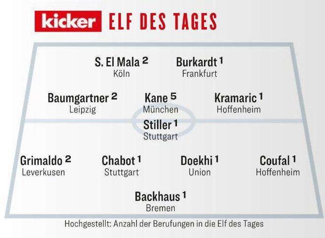 雷速体育10月20日宣 随着圣保利0-3不敌霍芬海姆,德甲第7轮的比赛全部结束,德国著名足球媒体《踢球者》评选了本轮最佳阵容。