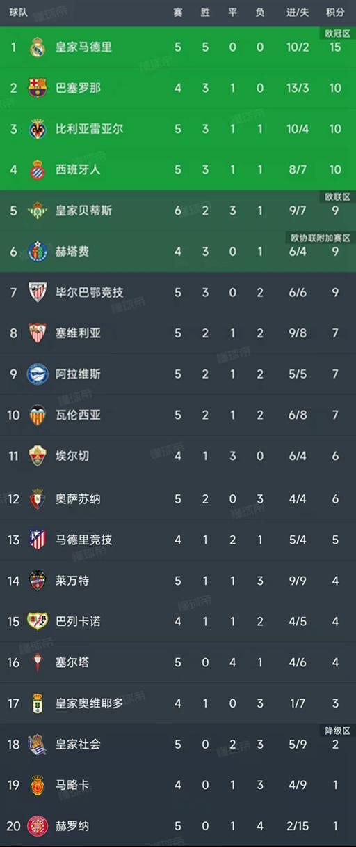 北京时间9月21日,西甲第5轮结束了6场比赛,最新积分榜如下!