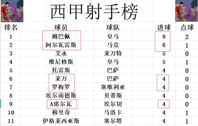 射手榜方面,姆巴佩9球高居榜首,阿尔瓦雷斯还是差姆巴佩3球排在第2,维尼修斯和艾永5球并列第3。A席尔瓦,罗梅罗破门,追上错失点球的莱万,将前十门槛提高到4球。