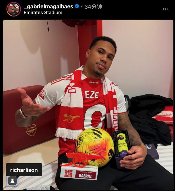 在阿森纳此役4-1大胜热刺后,因伤无法上场的加布里埃尔在社交媒体晒出他在更衣室反穿埃泽球衣的照片,照片中加布里埃尔腿上放着全场最佳球员奖杯和比赛用球(归属于埃泽)以及阿森纳10月最佳球员奖杯,此外,加布里埃尔还在图片中标记了里沙利松。